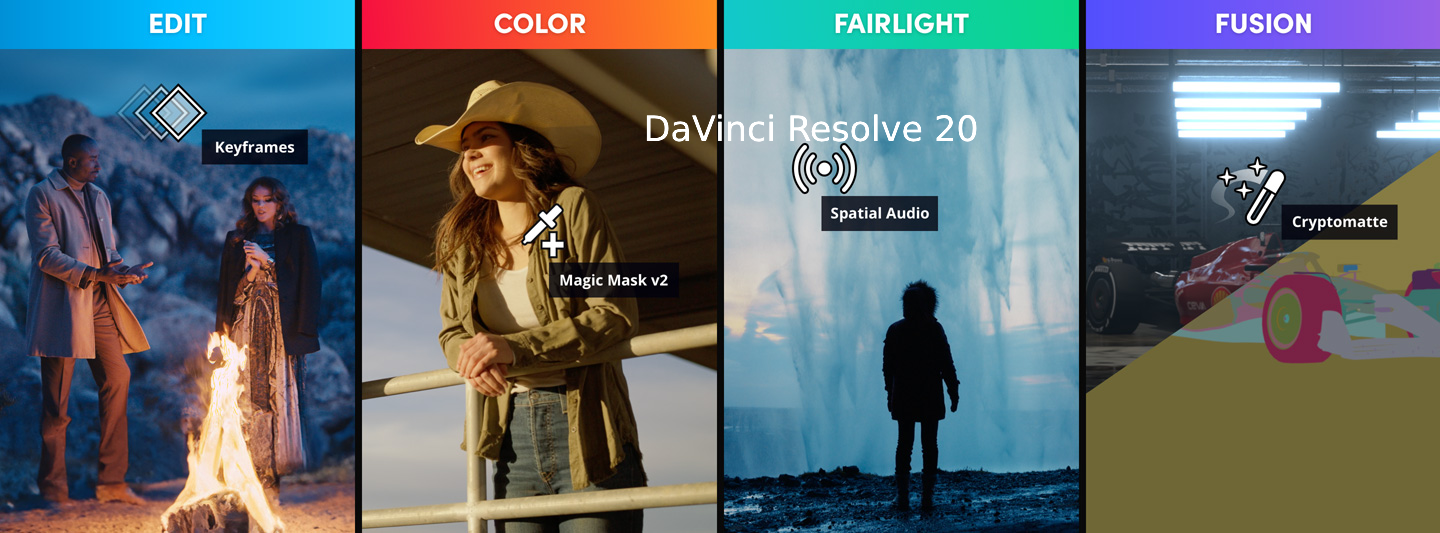 DaVinci Resolve 20 introduces more than 100 new features including powerful AI tools designed to assist you with all stages of your workflow. Use AI IntelliScript to create timelines based on a text script, AI Animated Subtitles to animate words as they are spoken, and AI Multicam SmartSwitch to assemble a timeline with camera angles based on speaker detection. The cut and edit pages introduce a dedicated keyframe editor and voiceover palettes, and AI Audio Assistant analyzes your audio and intelligently creates a professional audio mix. In Fusion, explore advanced multi layer compositing workflows. The Color Warper now includes Chroma Warp, plus Magic Mask and Depth Map have huge updates.
